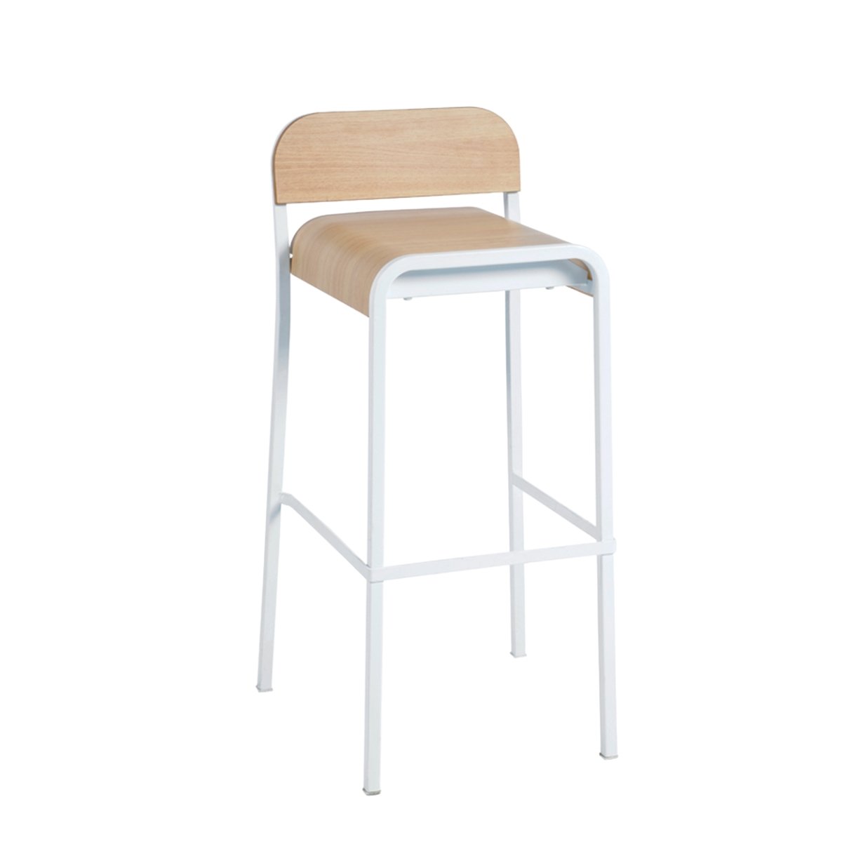 La modernité de la structure en acier blanc du tabouret est contrebalancée par la chaleur de l’assise en contreplaqué bois mat clair, pour composer une silhouette très géométrique. Elle optimise ainsi la résistance et la capacité d'empilage du tabouret, le rendant idéal pour les salons, sur des stands ou des espaces communs comme des restaurants.
